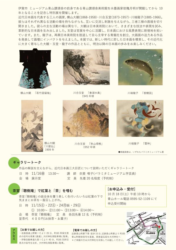 伊賀市 ミュージアム青山讃頌舎 開館10周年記念特別展 「大観 玉堂 龍子 近代日本画三大巨匠」