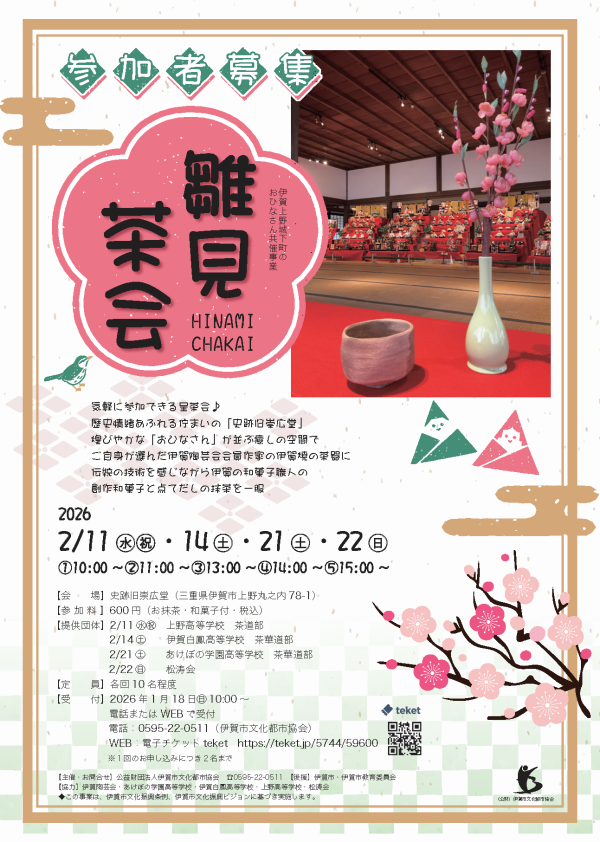 来館者ご自身で好きな伊賀焼のお茶碗を選んでいただき、伊賀市内高校の茶華道部の皆さま等に、お抹茶の点だしや和菓子の提供をしていただきます。おひなさまが並ぶ癒しの空間で、ゆっくりとした時間(ひととき)をお楽しみください。