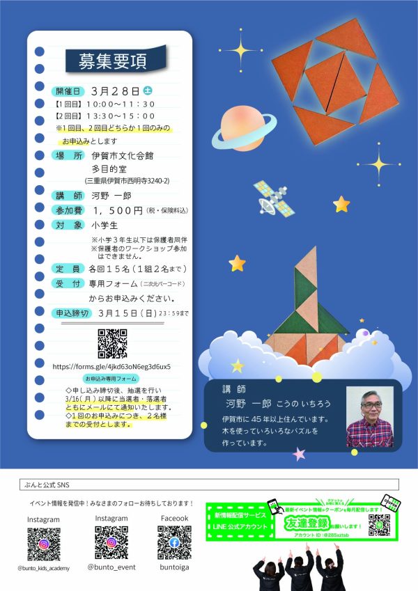 対象:小学生 ※小学3年生以下は保護者同伴。保護者のワークショップ参加はできません。