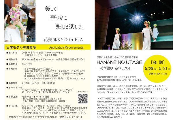 伊賀市文化会館・ぶんと35周年記念事業「HANANE NO UTAGE ―花が語り 音が伝える-」の特別公演ファッションショー「花美コレクションin IGA」の出演モデルを募集しています。